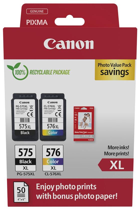photo value pack 2 x PG-575XL / CL-576XL, capaciteit: 300 tot 400 pagina's, 4 kleuren+ fotopapier (ft 10 x 15 cm, 50 vel)