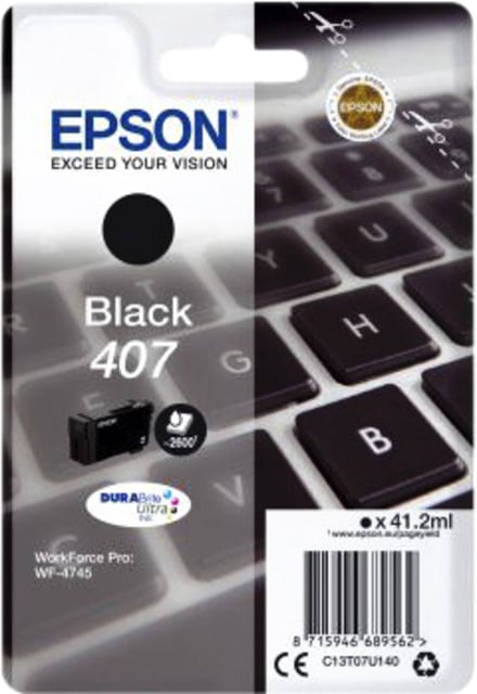 *Print gegarandeerd zonder problemen met de originele cartridges van Epson. * De documenten die je met de zwarte 407 print, kenmerken zich door kwalitatief hoogwaardige afdrukken. * Deze cartridge print tot 2600 paginas. * Binnen de Epson printers heb je vaak de mogelijkheid om in plaats van een gewone cartridge een XL/HC (high capacity) te gebruiken voor nog meer en goedkoper printen. * Deze XL/HC cartridge vind je dan terug bij de alternatieven. * Weten of je de juiste cartridge hebt? Kijk dan bij de specificaties geschikt voor of jou Epson printer ertussen staat.* Aantal afdrukken: 2600* Inhoud (Netto): 41.2