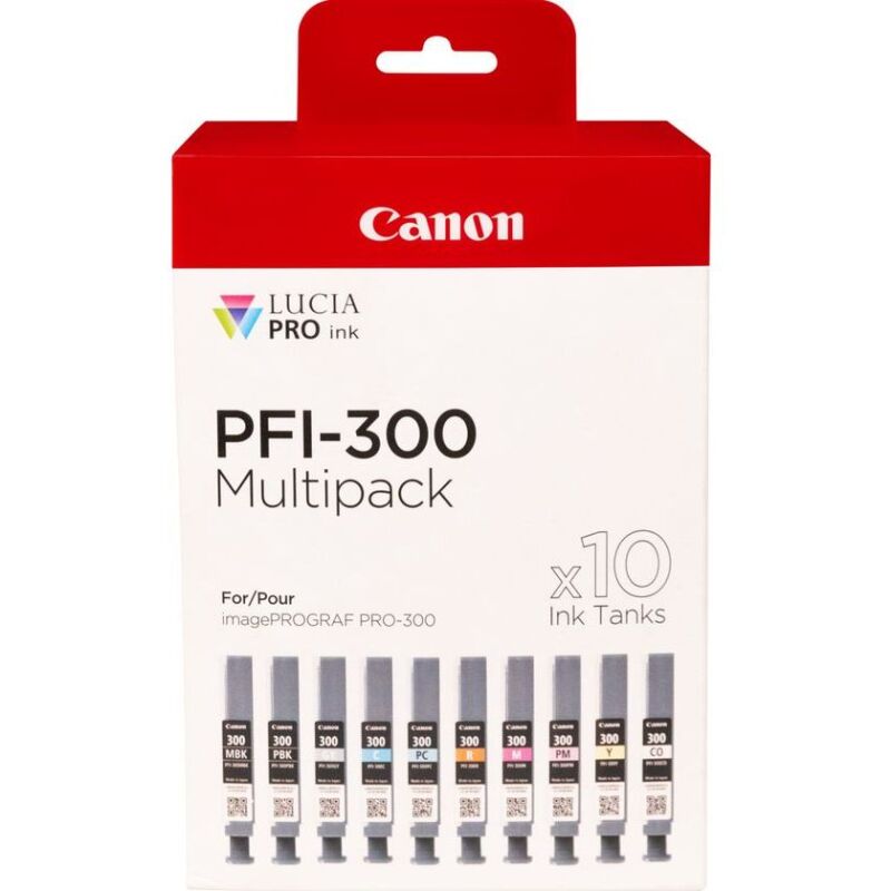 De PFI-300 multipack van Canon bevat 10 inktcartridges met de printkleuren: Zwart, Blauw, Cyaan, Grijs, Magenta, Foto zwart, Foto magenta, Rood en Geel. De inktcartridges zijn geschikt voor de Canon imagePROGRAF PRO-300.