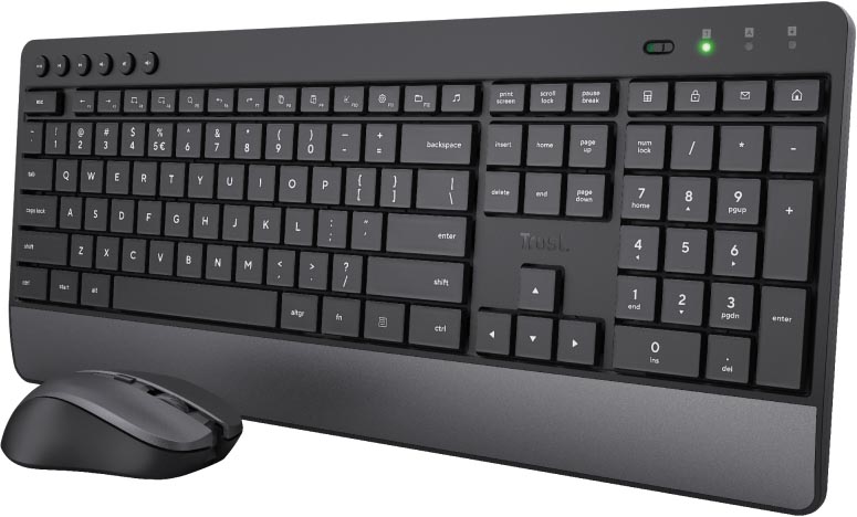 Full-size toetsenbord met standaardindeling om comfortabel te typen Met geïntegreerde polssteun Compacte draadloze muis met verstelbare gevoeligheid Stille toetsen en knoppen Een opbergbare micro-USB-ontvanger voor beide apparaten Toetsenbord werkt op2 AA-batterijen, muis werkt op 1 AA-batterij (meegeleverd) Gerecycleerd materiaal: 85 % gerecycleerde plastiek