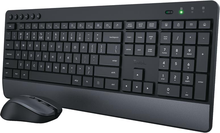 Full-size toetsenbord met standaardindeling om comfortabel te typen Met geïntegreerde polssteun Compacte draadloze muis met verstelbare gevoeligheid Stille toetsen en knoppen Een opbergbare micro-USB-ontvanger voor beide apparaten Toetsenbord werkt op2 AA-batterijen, muis werkt op 1 AA-batterij (meegeleverd) Gerecycleerd materiaal: 85 % gerecycleerde plastiek